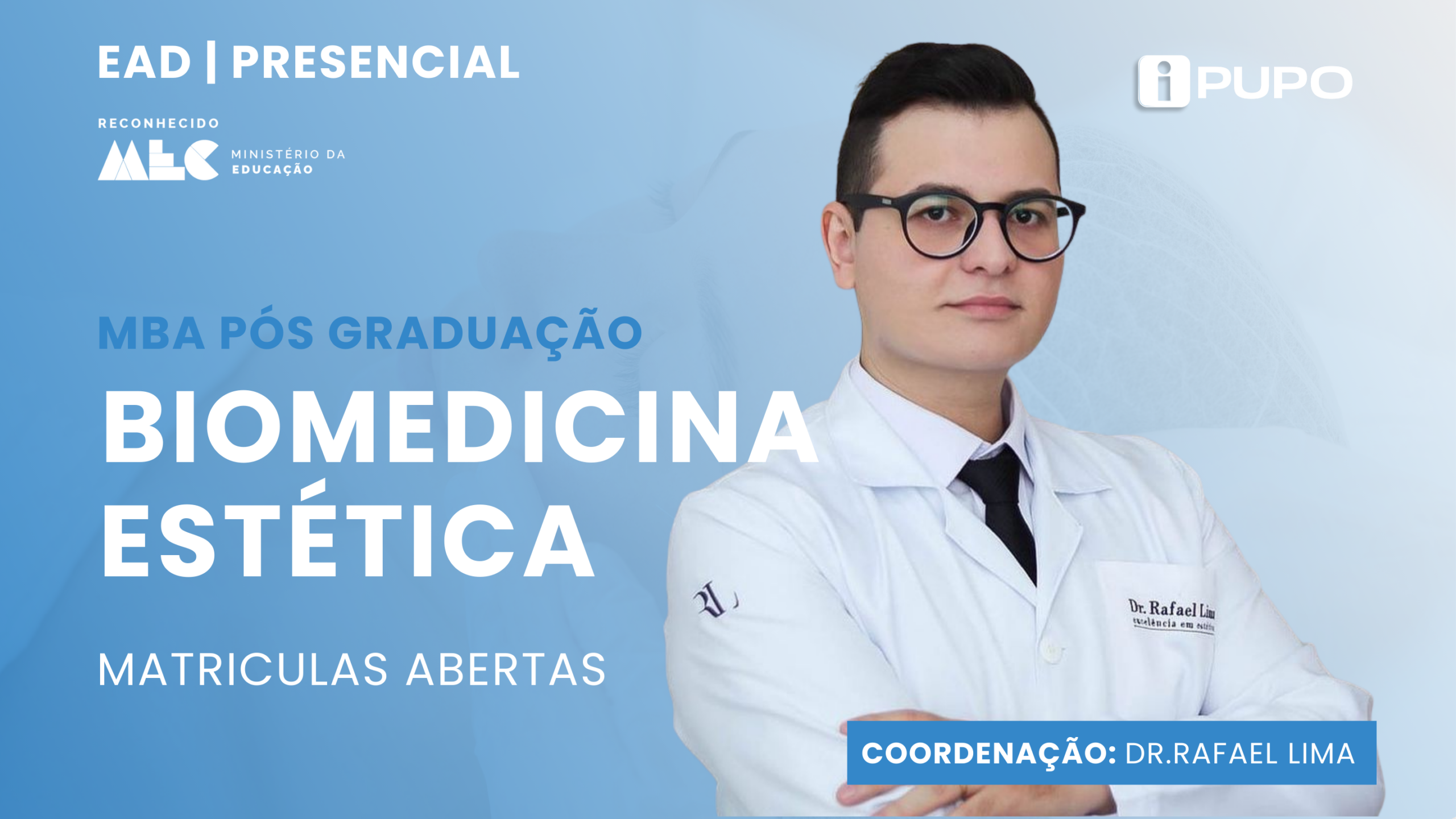 Coordenador das Pós-graduações em Estética do IPUPO. Biomédico, Especialista em Estética, graduando em Medicina e Mestrando em Ciências da Saúde. Possui 8 anos de atuação clínica e 5 anos de docência em especializações, com foco em raciocínio clínico científico. É idealizador da imersão Intima Concept e Master Meeting em Estética. Habilitado em Análises Clínicas, Farmacologia e Ozonioterapia.